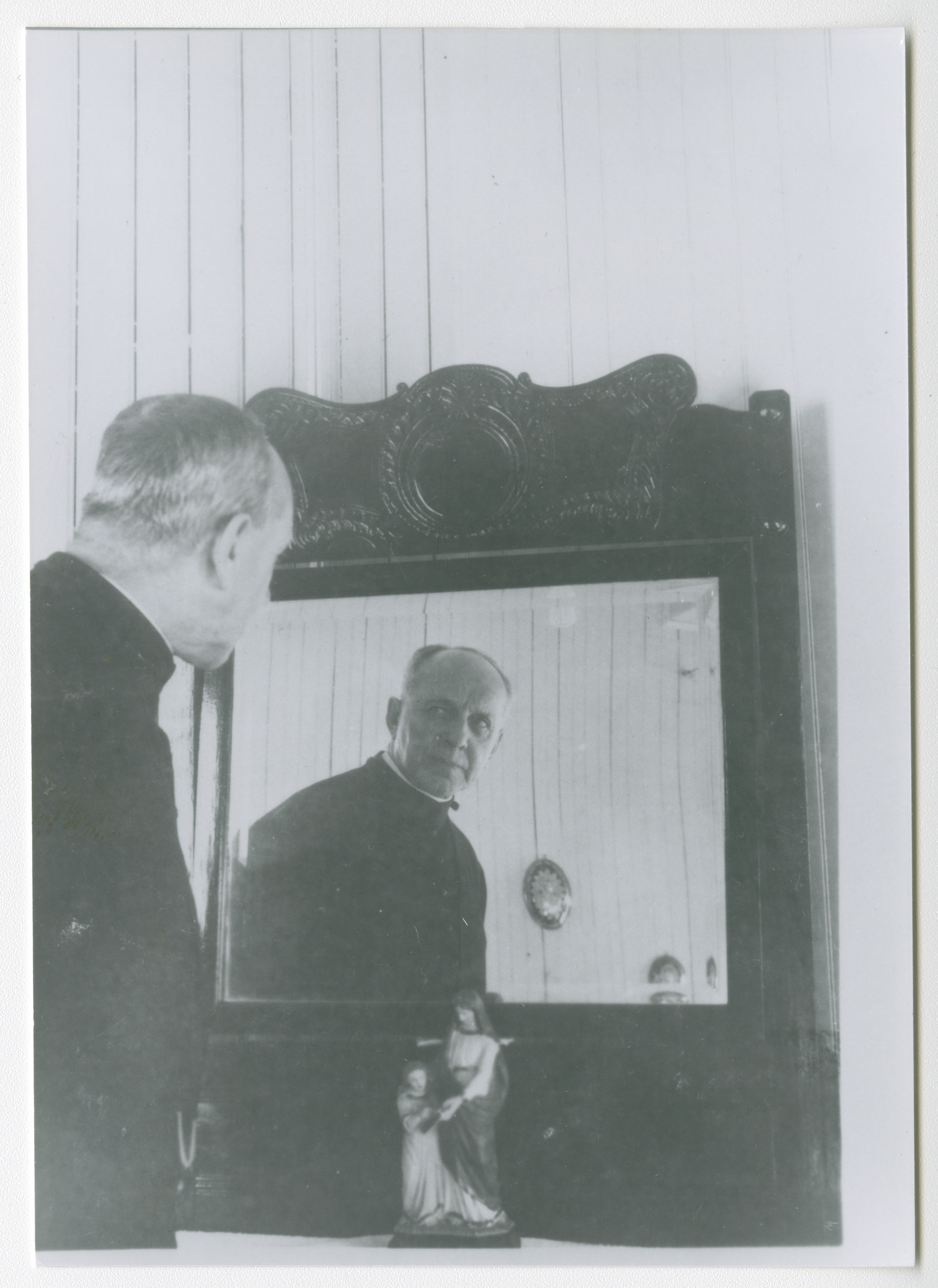Louis-Philippe Martel in front of a mirror. Photo taken by himself. An icon of Mary lays in front of him.