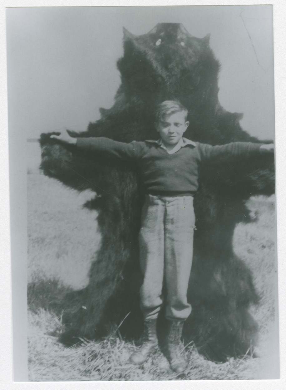 Yvan Prince (allochtone) pose, les bras tendus de chaque côté de son corps, devant une peau d'ours.
