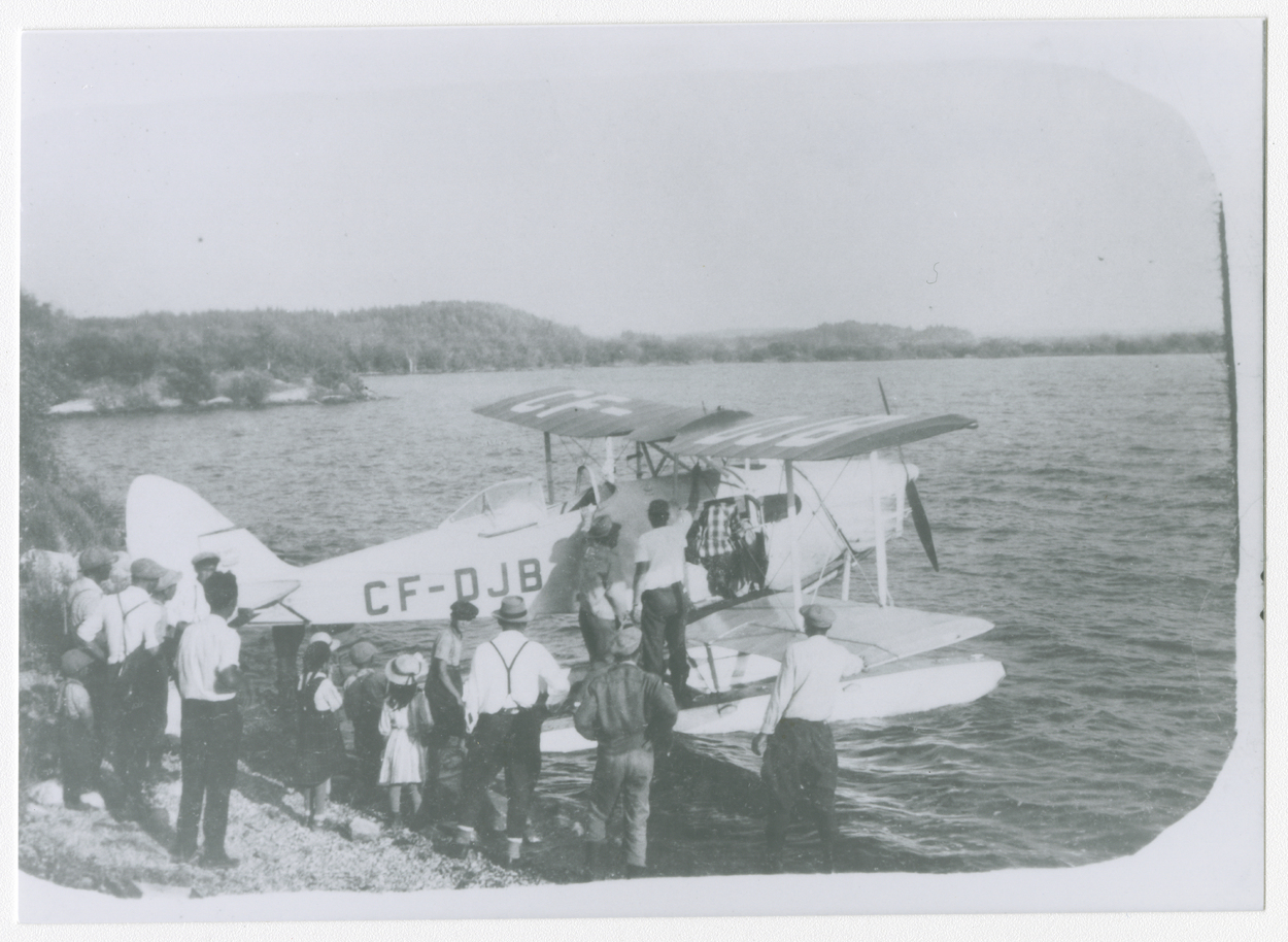 Lac Abitibi: avion de la police fédérale. Transport de prisonniers vers la prison d'Amos (?). Attroupement de spectateurs. [Bibliothèque et Archives nationale du Québec]