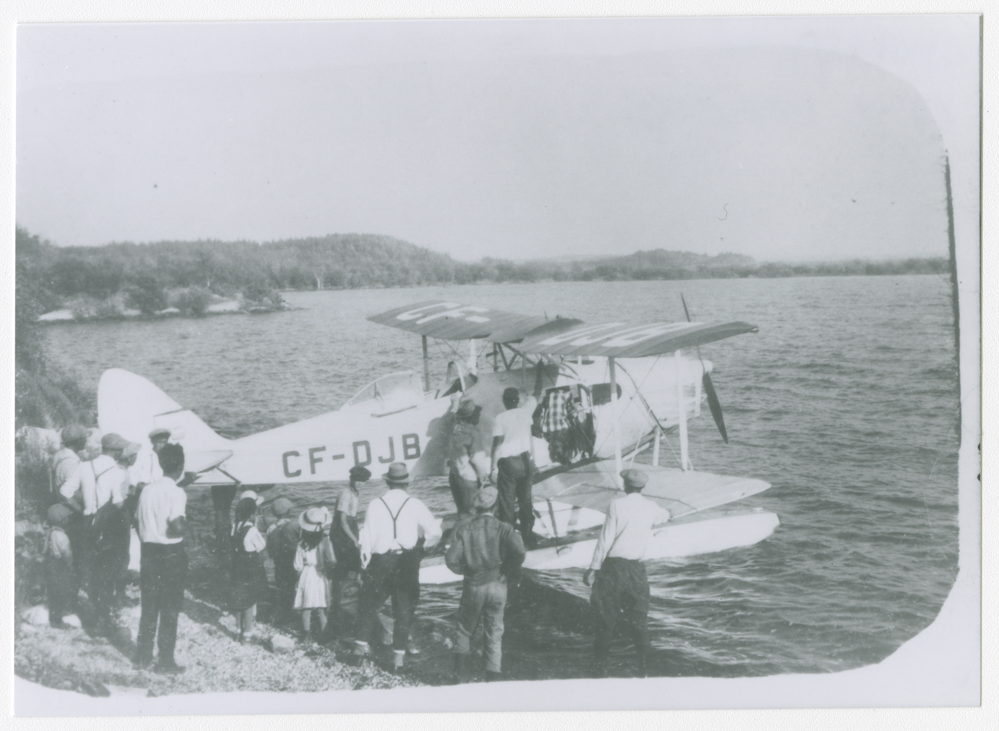 Des personnes sont attroupées autour d'un biplan amerri. Deux hommes se tiennent sur le ski droit de l'appareil.