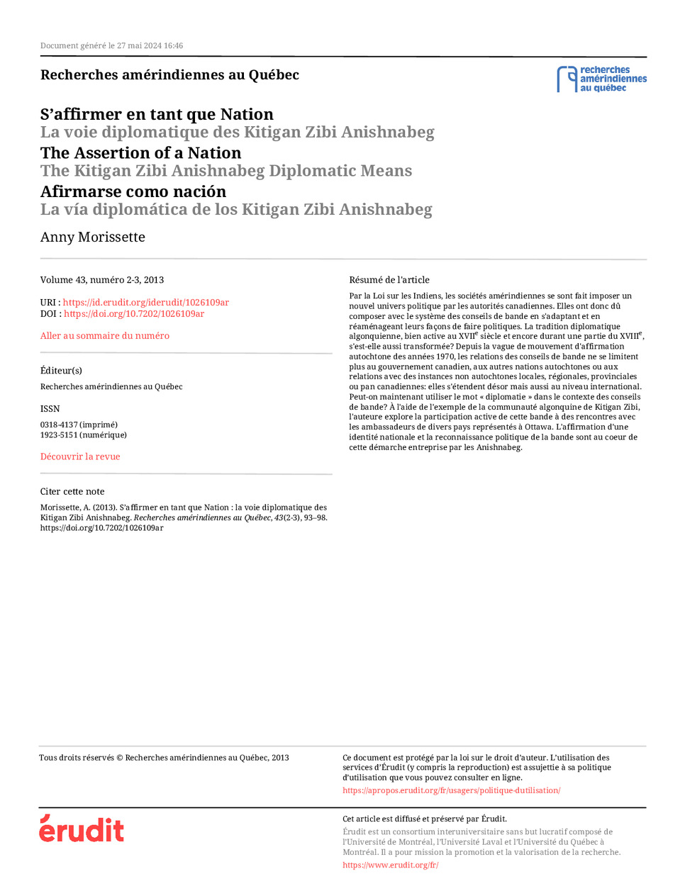 relations avec des instances non autochtones locales, régionales, provinciales ou pan canadiennes: elles s'étendent désor mais aussi au niveau international. Peut-on maintenant utiliser le mot « diplomatie » dans le contexte des conseils de bande? À l'aide de l'exemple de la communauté algonquine de Kitigan Zibi, l'auteure explore la participation active de cette bande à des rencontres avec les ambassadeurs de divers pays représentés à Ottawa. L'affirmation d'une identité nationale et la reconnaissance politique de la bande sont au coeur de cette démarche entreprise par les Anishnabeg. - Format