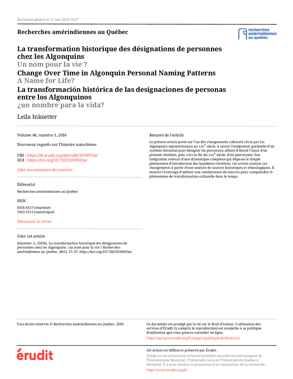 Le présent article porte sur l’un des changements culturels vécus par les Algonquins septentrionaux au xixe siècle, à savoir l’intégration graduelle d’un système binomial pour désigner les personnes, alliant d’abord l’ajout d’un prénom chrétien, puis, vers la fin du xixe siècle, d’un patronyme. Son intégration relevait d’une dynamique complexe qui dépasse le simple phénomène d’introduction des baptêmes chrétiens. Cet article analyse ces changements à partir d’une analyse de sources historiques et ethnologiques. Il montre l’avantage d’utiliser une combinaison de sources pour comprendre le phénomène de transformation culturelle dans le temps. - Format