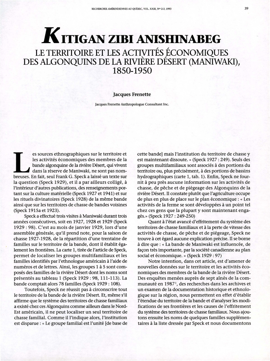 Kitigan Zibi anishinabeg, le territoire et les activités économiques des Algonquins de la rivière désert (Maniwaki), 1850-1950