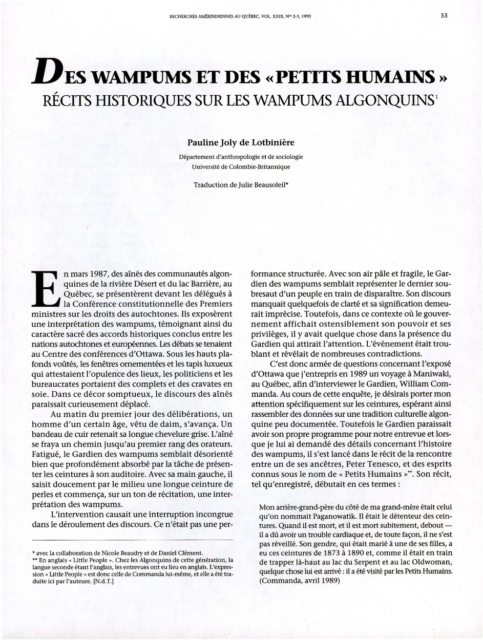 Des wampums et des « petits humains », récits historiques sur les wampums algonquins