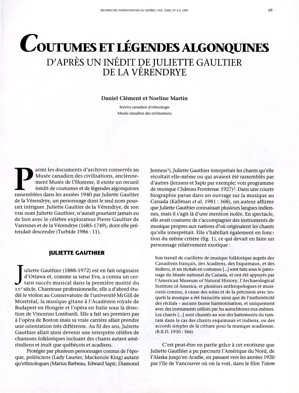 Coutumes et légendes algonquines, d’après un inédit de Juliette Gaultier de La Vérendrye