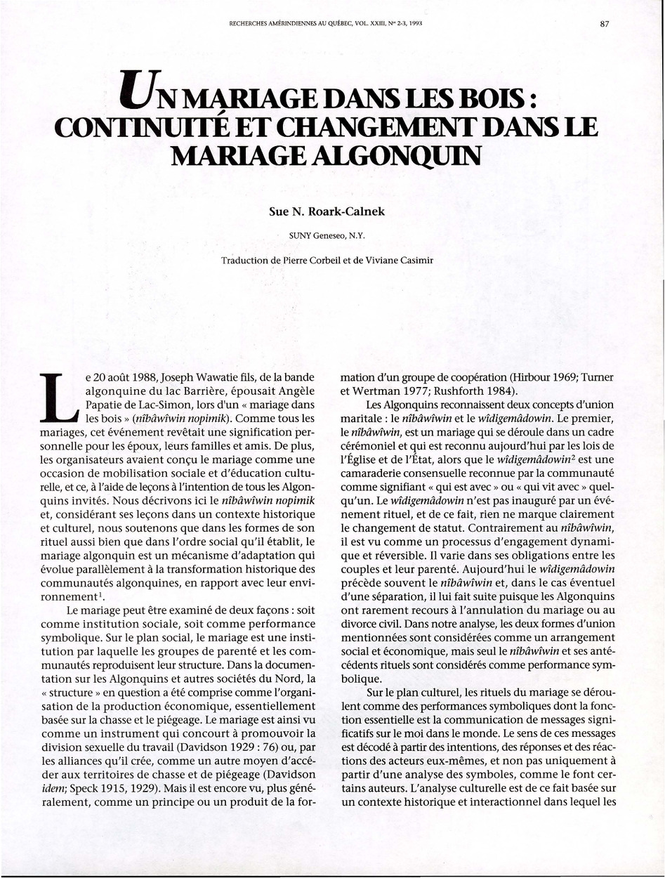Un mariage dans les bois : continuité et changement dans le mariage algonquin
