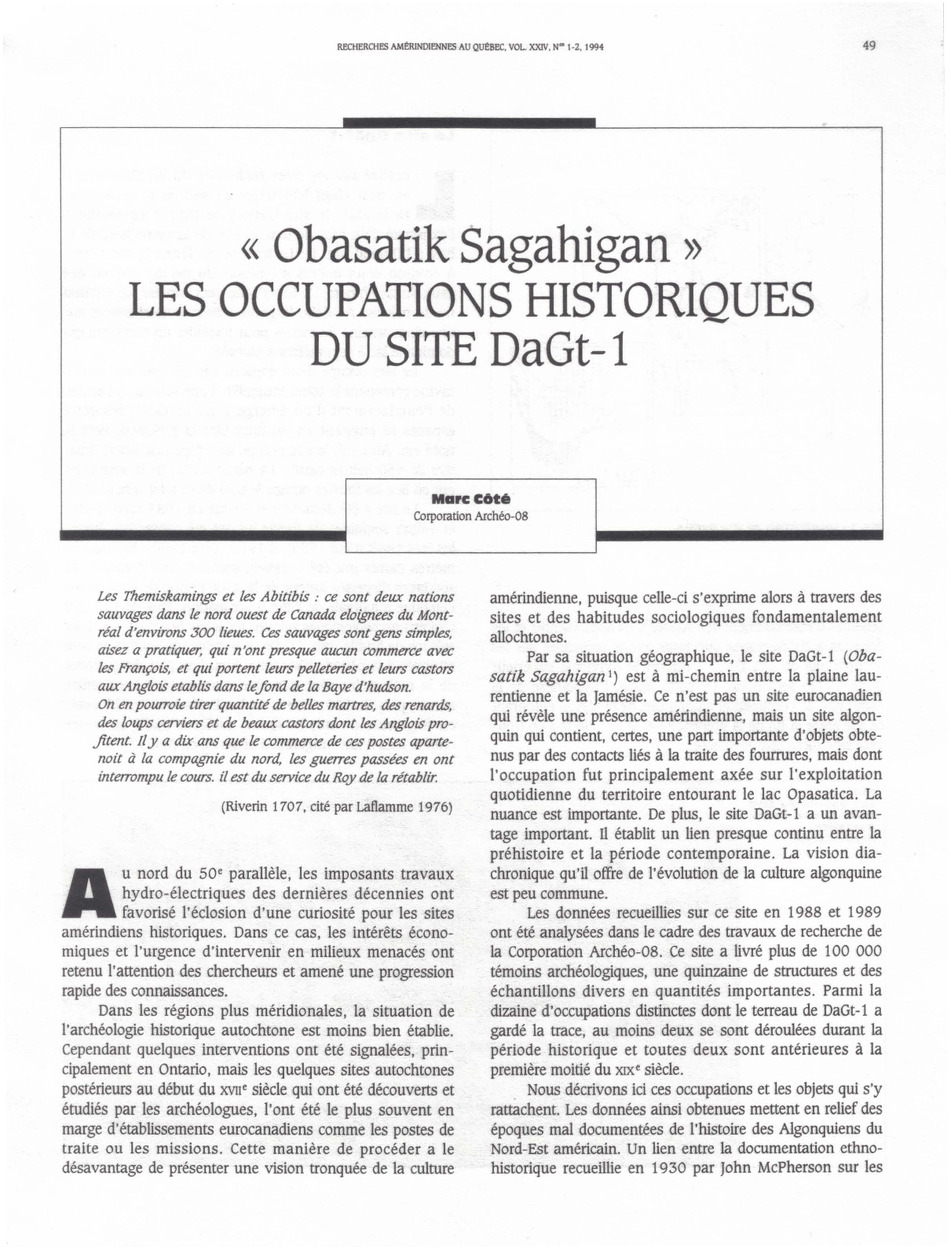 Ce texte présente les résultats des fouilles archéologiques du site DaGt-1, un ancien campement algonquin situé au bord du lac Opasatica. Deux périodes d’occupation historique ont été identifiées : l’une à la fin du XVIIᵉ siècle et l’autre au début du XIXᵉ siècle. Les artefacts retrouvés (perles de verre, pipe, pierres à fusil, sceau à fourrure, objets en métal) témoignent de la transition entre les pratiques traditionnelles autochtones et l’influence croissante du commerce eurocanadien.