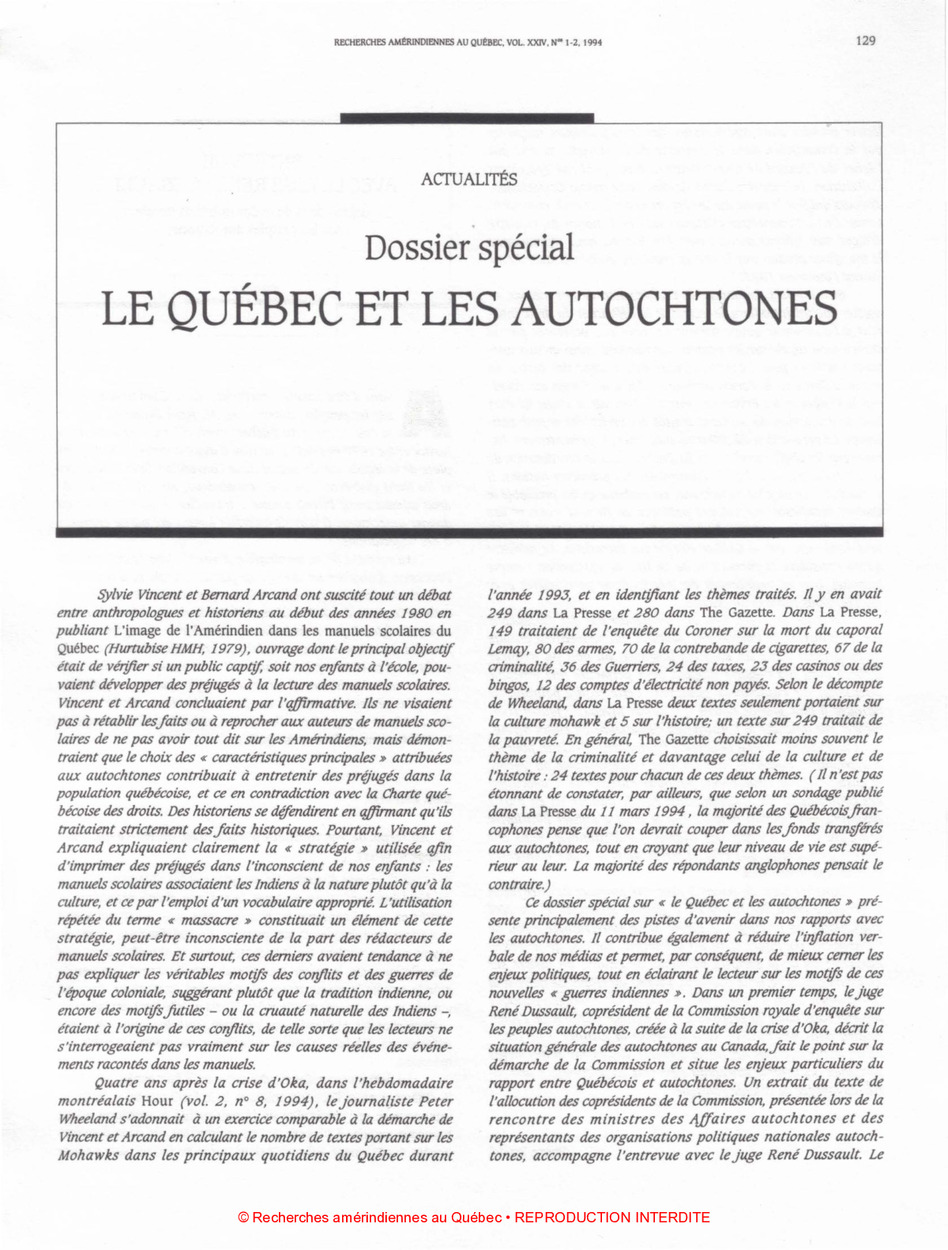 Ce dossier spécial, publié dans Recherches amérindiennes au Québec, explore les relations entre le Québec et les peuples autochtones à la suite de la crise d’Oka. Il s’articule autour de plusieurs axes :
