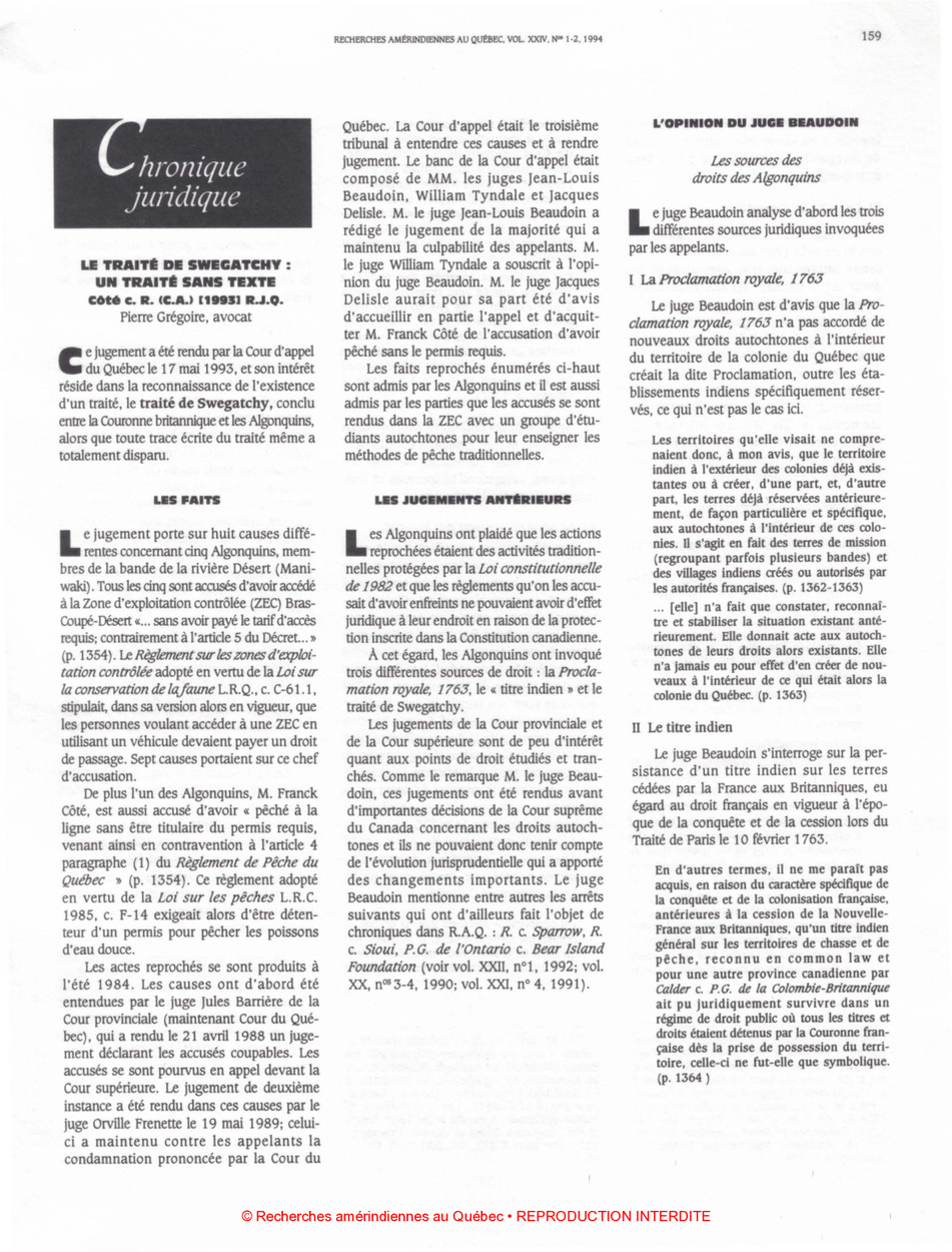 Ce texte analyse un jugement de la Cour d’appel du Québec (1993) concernant des Algonquins accusés d’avoir pêché et circulé dans une ZEC sans permis. Les accusés invoquent le traité de Swegatchy (1760), bien que non écrit, comme fondement de leurs droits ancestraux. Le juge Beaudoin reconnaît l’existence du traité et conclut que les Algonquins ont des droits de chasse et de pêche protégés par l’article 35 de la Loi constitutionnelle de 1982. Il juge que les règlements contestés sont des atteintes justifiées, sauf pour le permis de pêche, où le juge dissident Delisle estime que l’obligation de permis est une restriction injustifiée à une activité de subsistance.