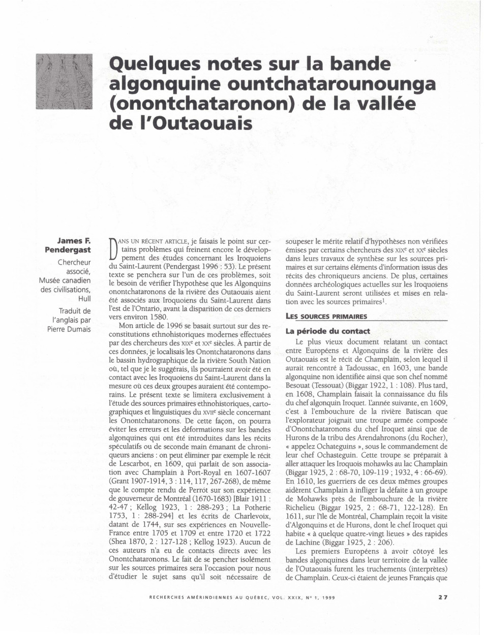 Ce texte de James F. Pendergast examine les origines, la localisation et les relations historiques de la bande algonquine des Onontchataronons (ou Ountchatarounoungas) dans la vallée de l’Outaouais, en s’appuyant exclusivement sur des sources primaires du XVIIe siècle (récits de Champlain, Relations des Jésuites, cartes anciennes). L’auteur conclut que cette bande était distincte de la Petite Nation (Weskarinis), qu’elle occupait un territoire au sud de l’île aux Allumettes avant d’être dispersée par les Iroquois vers 1640, et qu’aucune preuve archéologique ou documentaire ne confirme leur présence sur l’île de Montréal avant cette date.