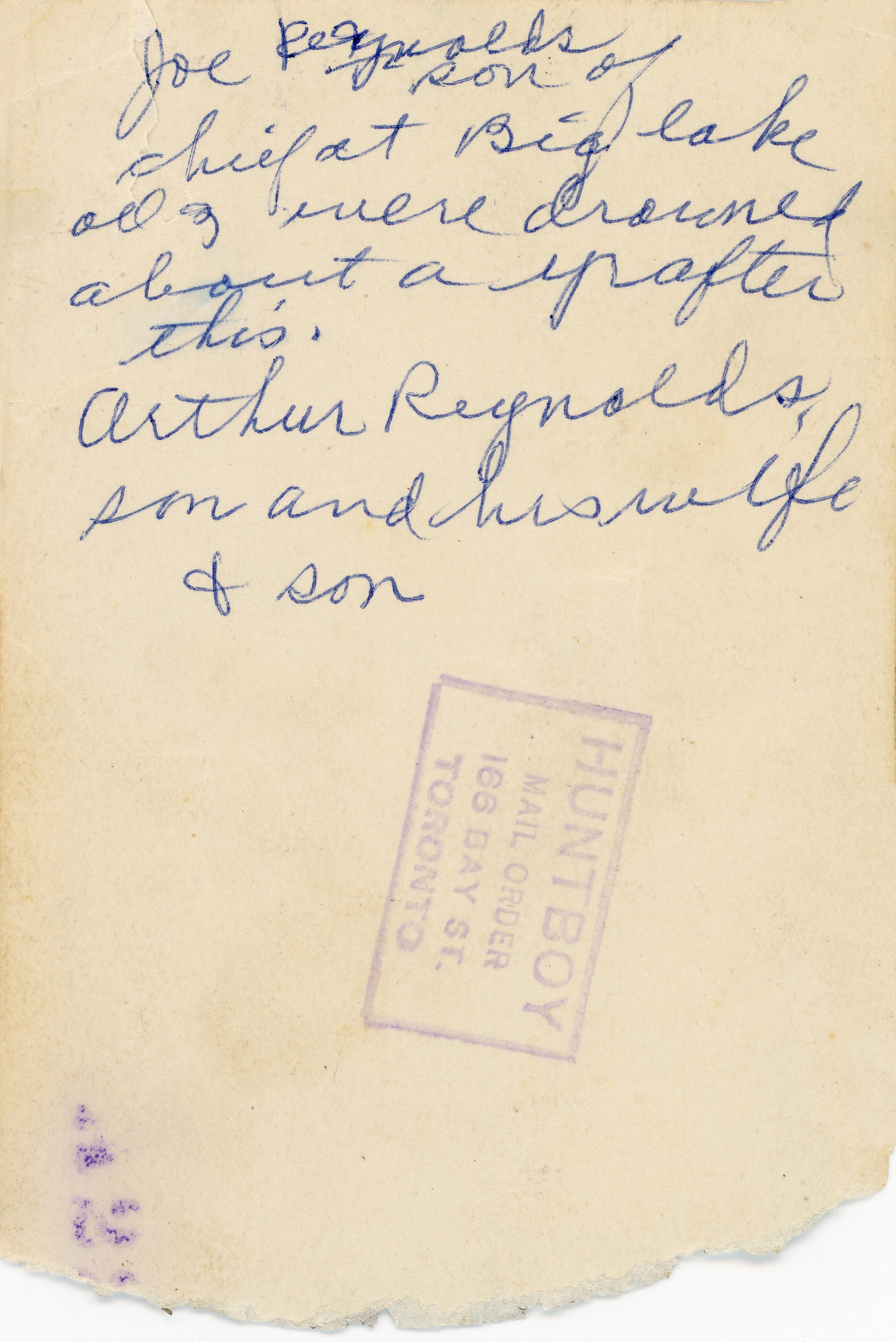 Verso : « Joe Reynolds son & chief at Big Lake all were drowned about a year after this. Arthur Reynolds' son and his wife & son. »