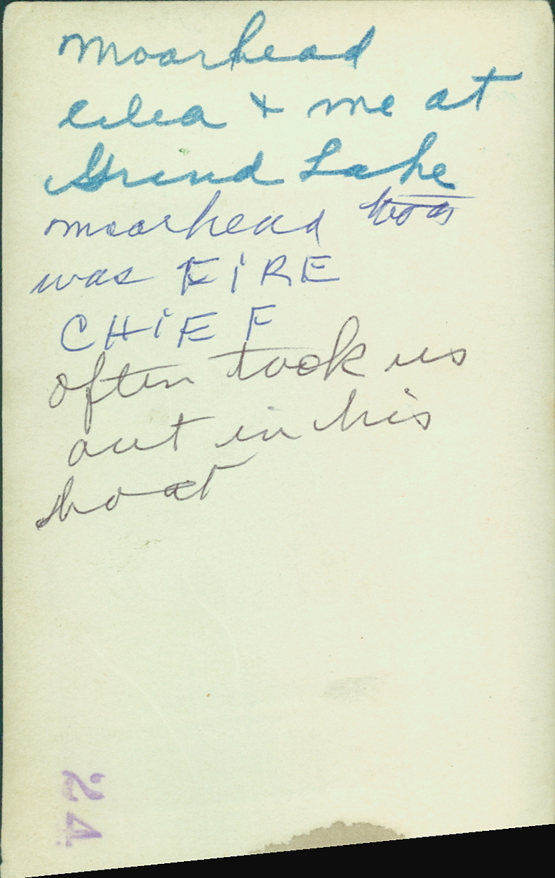 Verso : « Moonhead Celia + me at Grand Lake. Moonhead was Fire Chief. After took us out in his boat. »