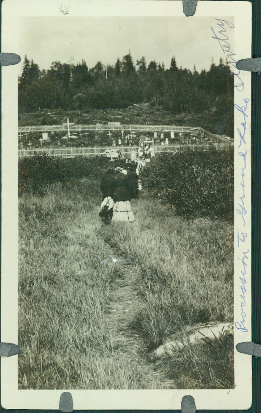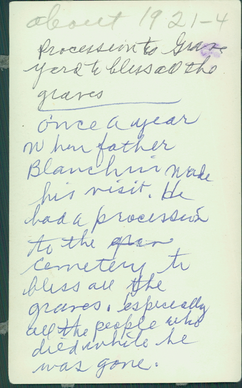 Verso : « About 1921-4. Procession to graveyard to bless all the graves. Once a year when father Blanchin made his visit. He had a procession to the [?] cemetery to bless all the graves, especially all the people who died while he was gone. »