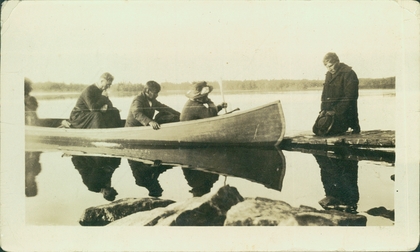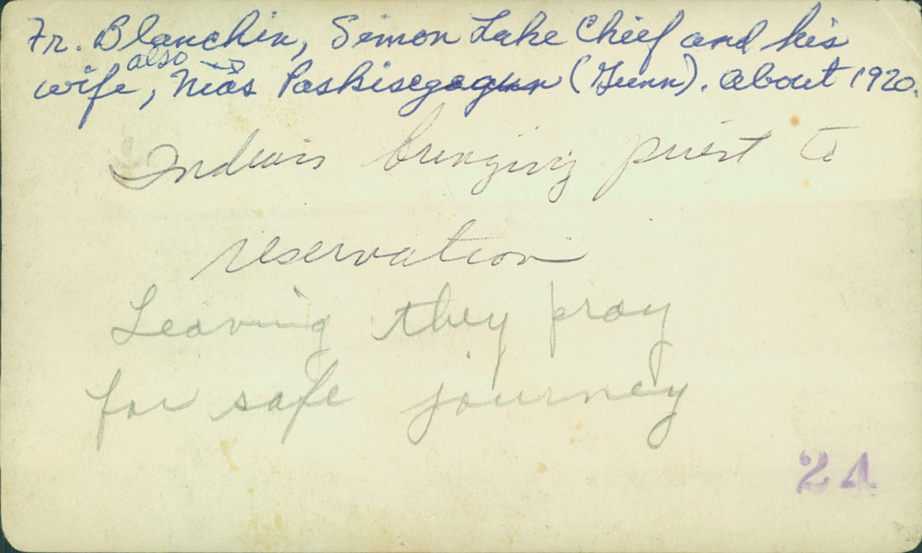 Verso : « Father Blanchin, Simon Lake Chief and his wife, near Pashisegagun (?) [?]. About 1920. Indians bringing present to reservation leaving they pray for safe journey. »