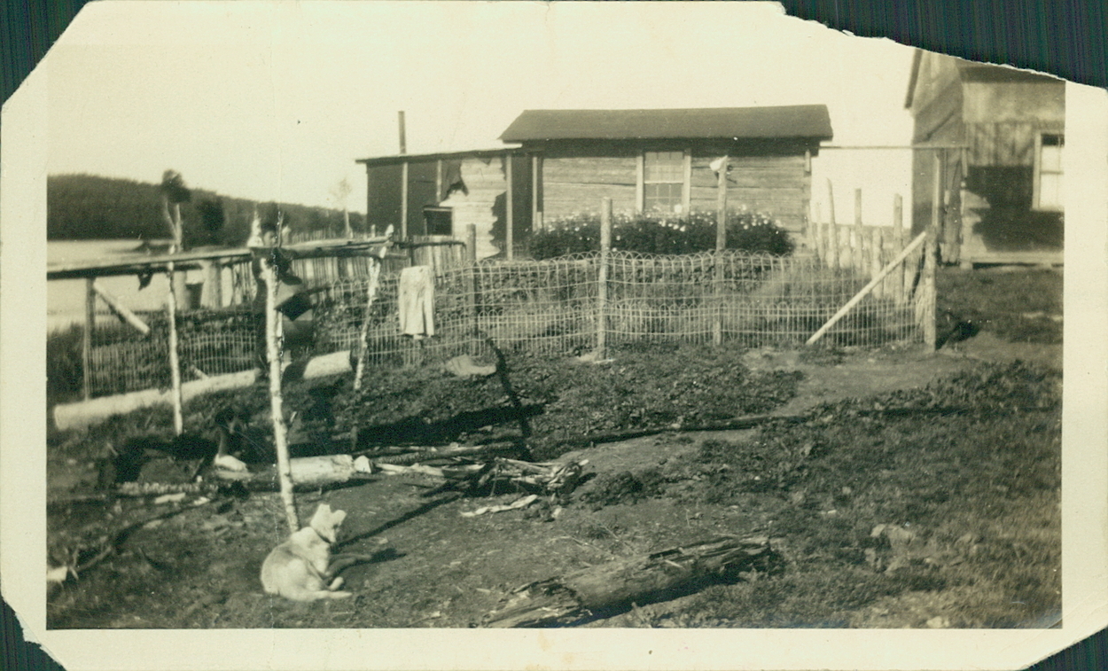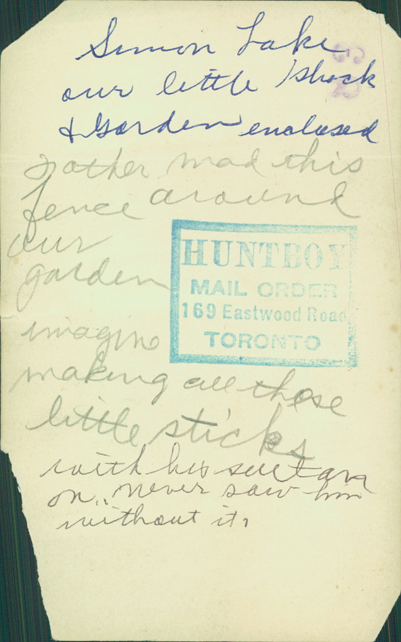 Verso : « Simon Lake our little shack & garden [?]. Father made ths fence around our garden. Imagine making all thos little sticks with his [?] on. Never saw him without it. »