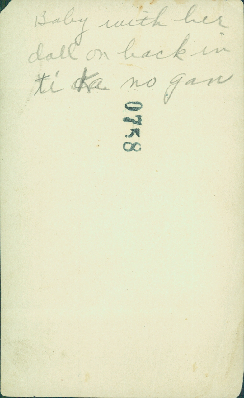 Verso : « Baby with her doll on back in ti ka no gan. »