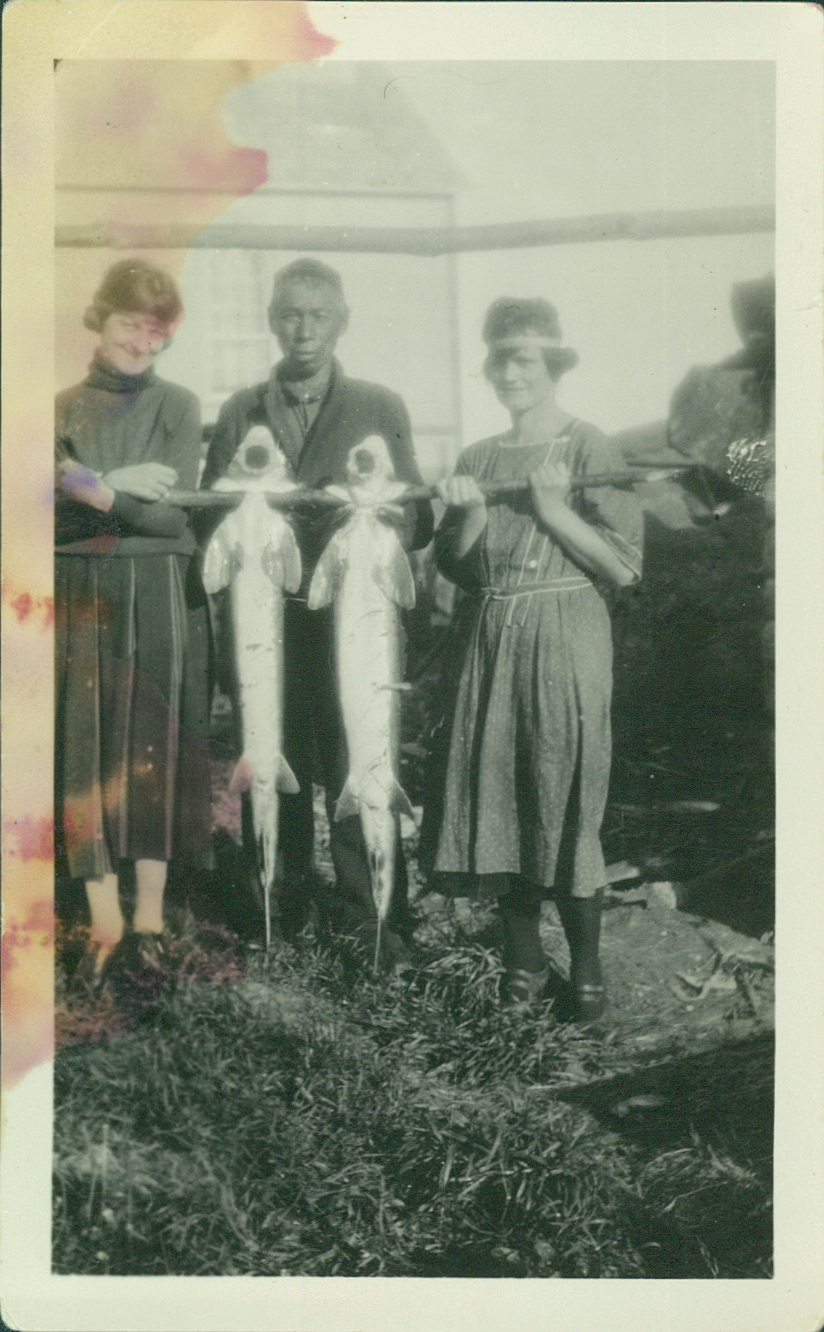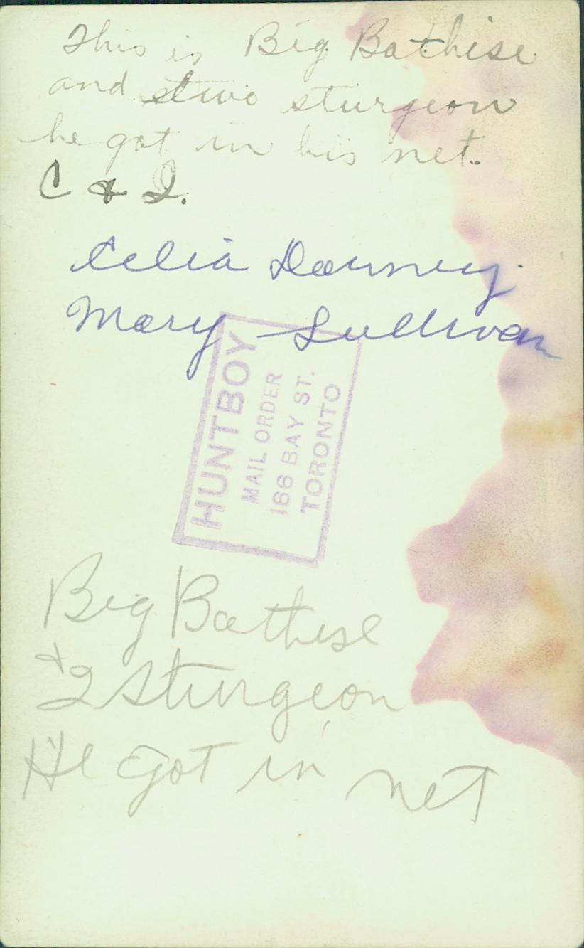Verso : « This is Big Bathise and two sturgeons he got in his net. Celia Downey. Mary Sullivan. Big Bathise. 2 sturgeon he got in net. »