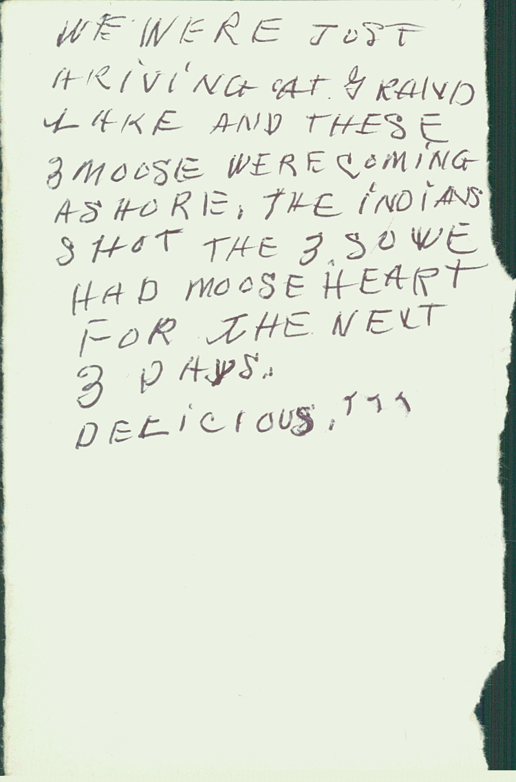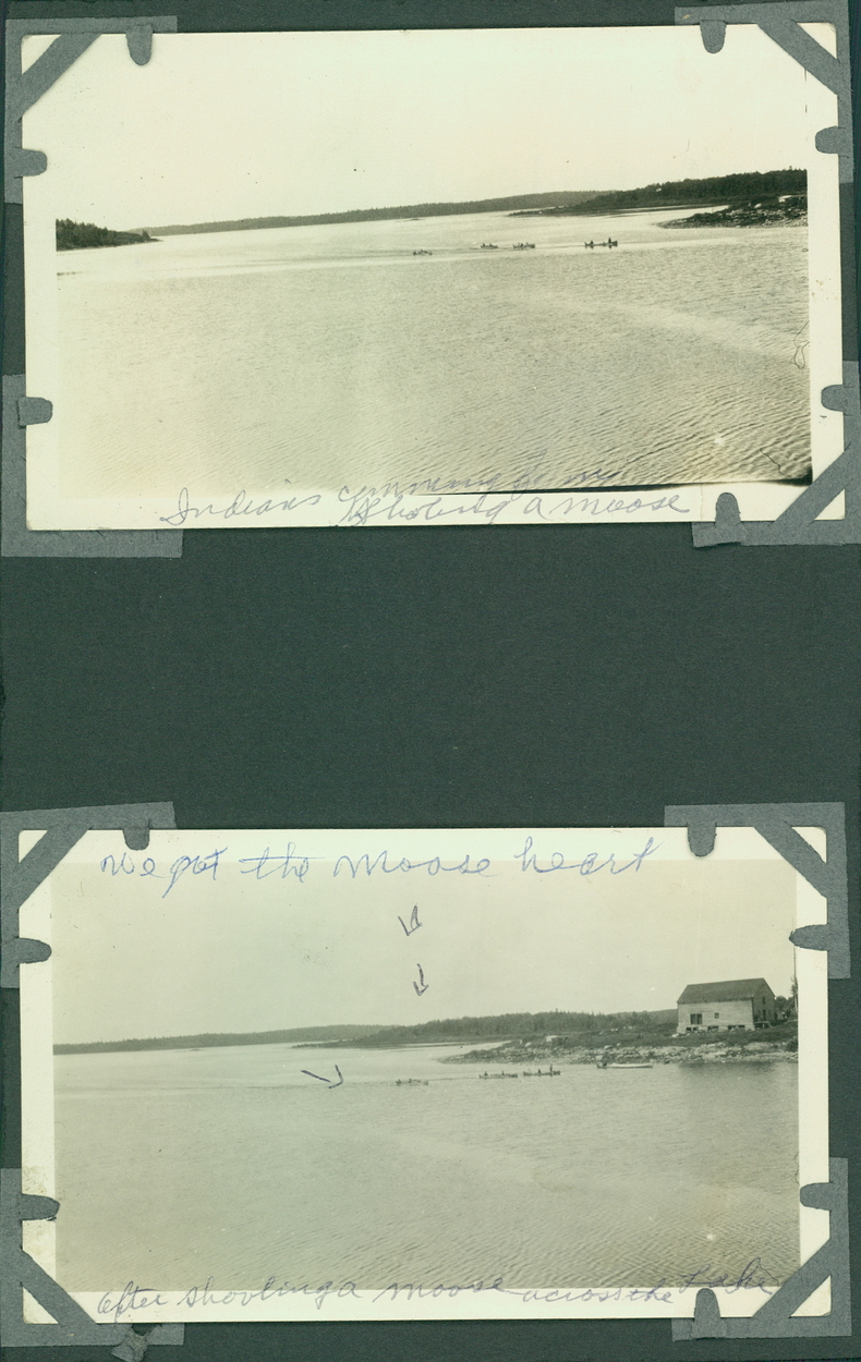Note attachée au document : « We were just ariving at Grand Lake and these 3 mooses were coming ashore, the Indians shot the 3 so we had moose heart for the next 3 days. Delicious! »