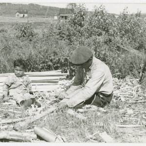 Deux hommes s'affairent avec des planches de bois.
