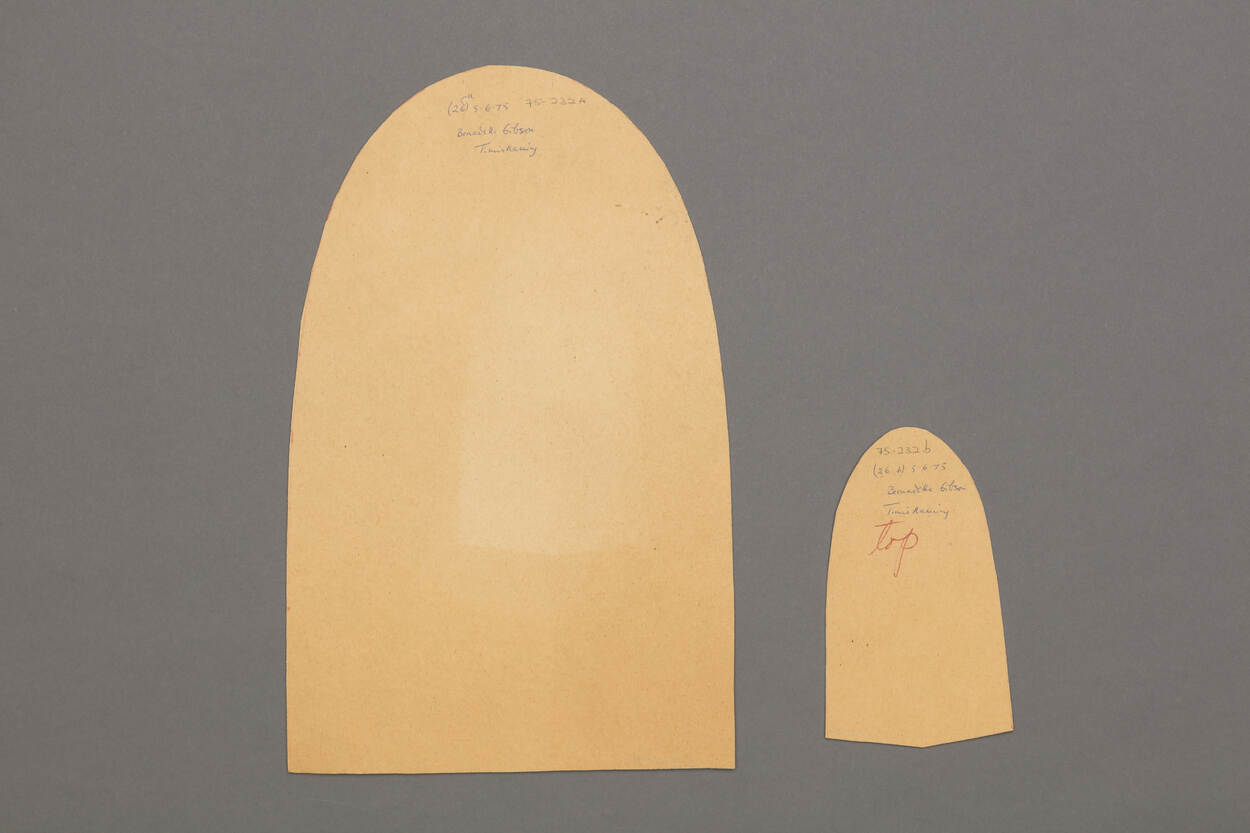 A truncated oval piece of cardboard, used as a template for cutting a moccasin sole.