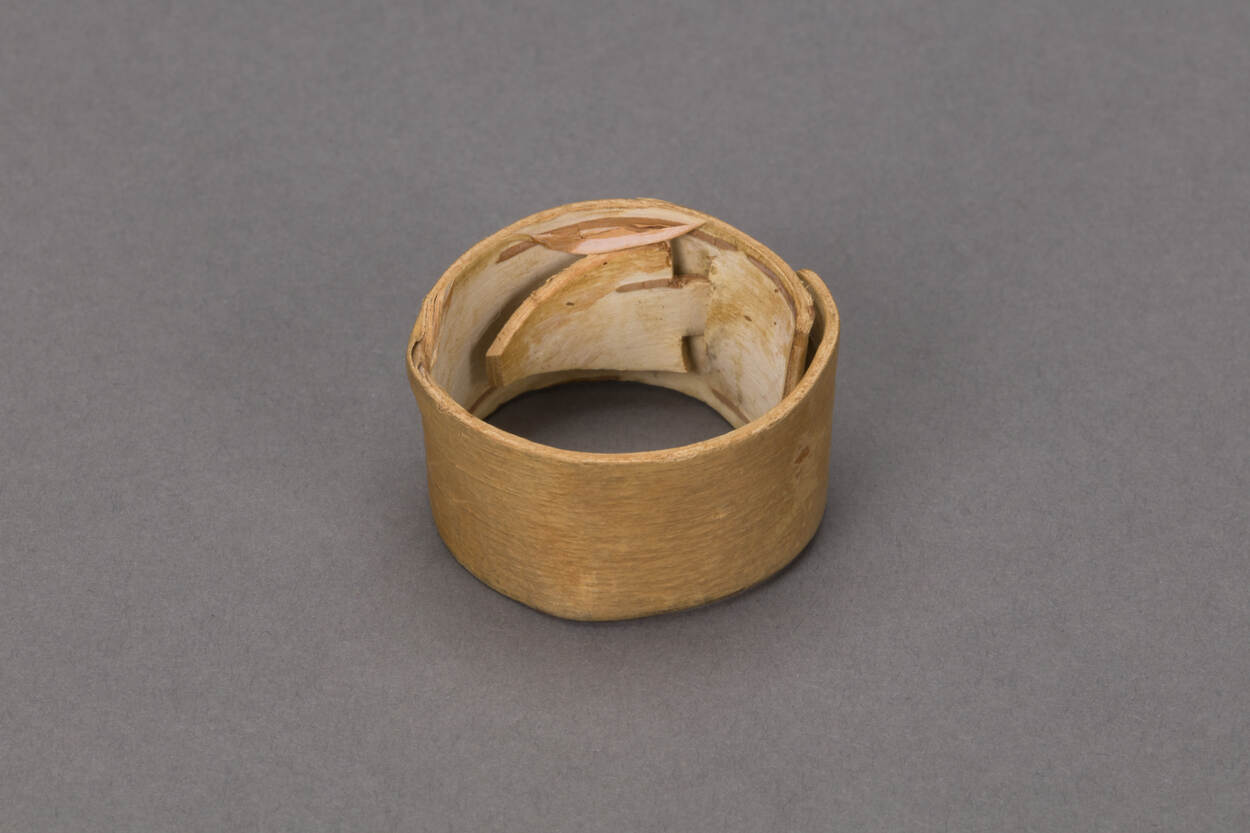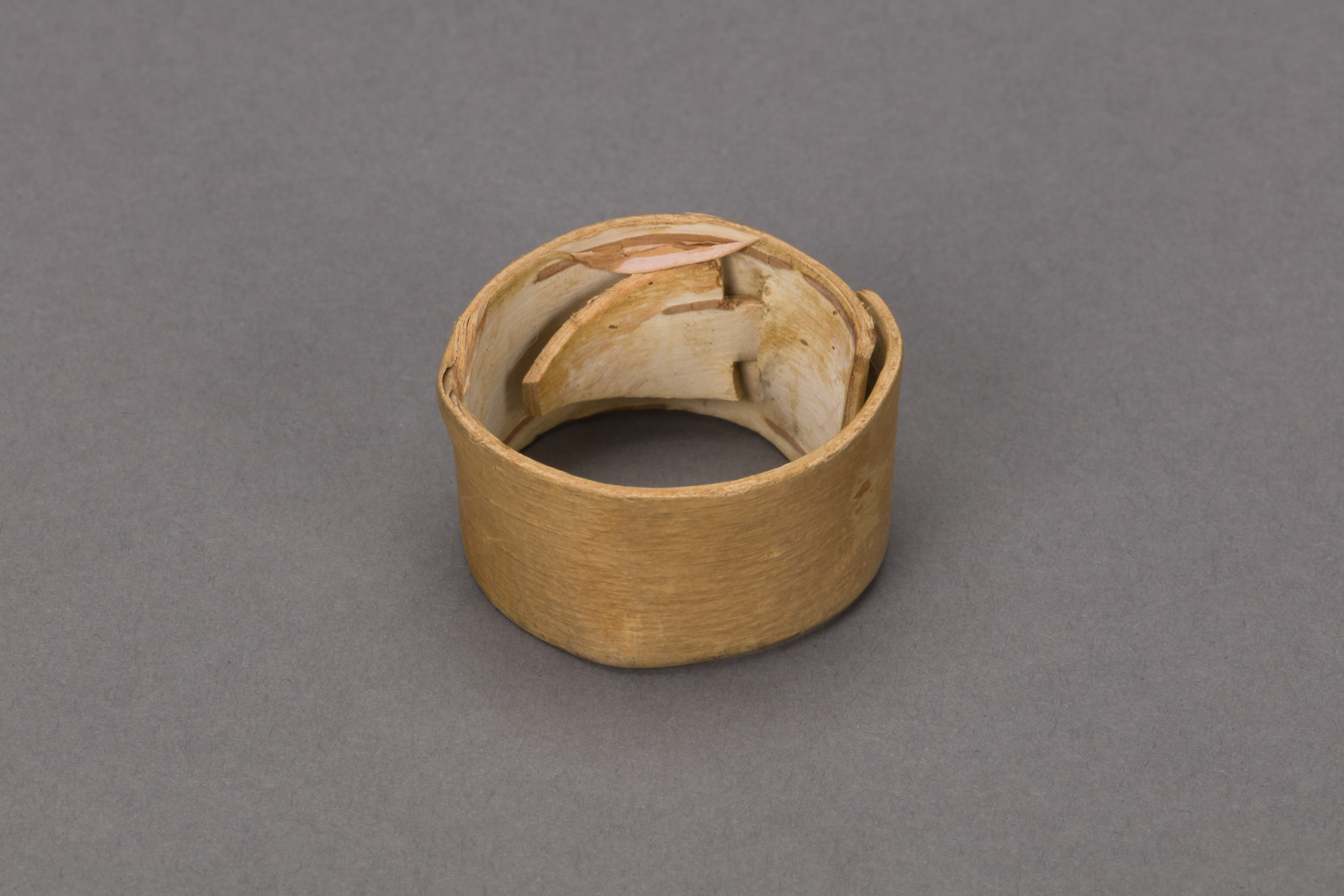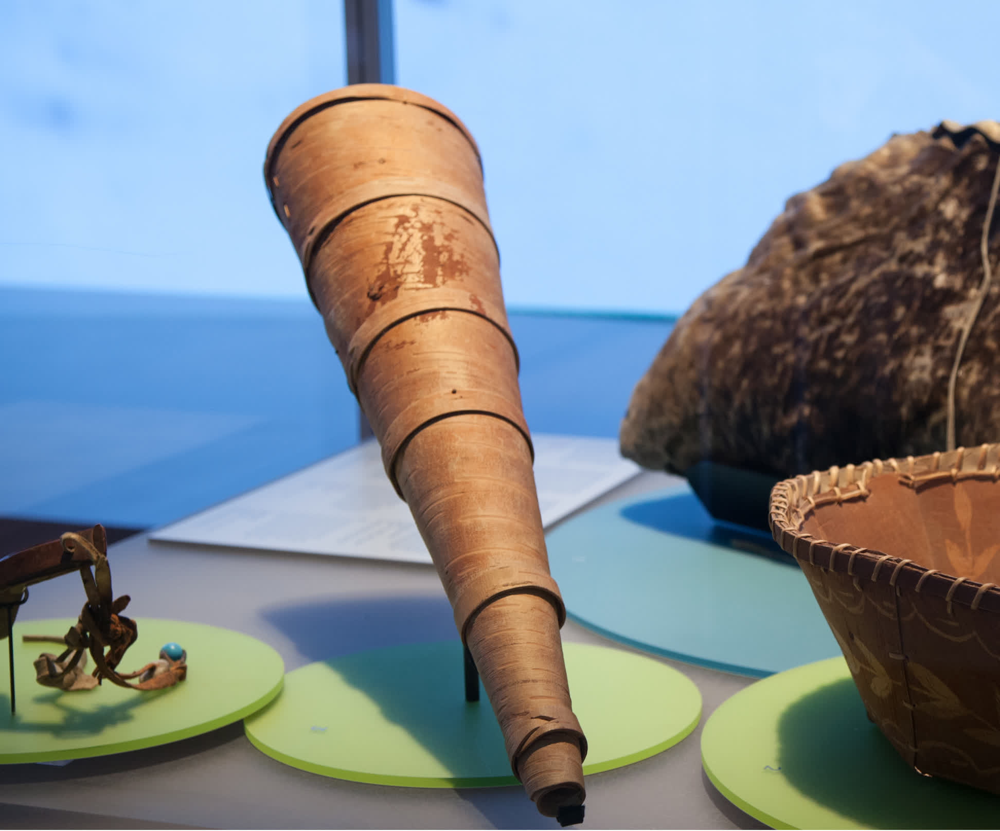 Birchwood bark piece in conical shape, coiled and attached by seven stripes, wrapped on the height of the main piece. Spruce tree roots sewing.