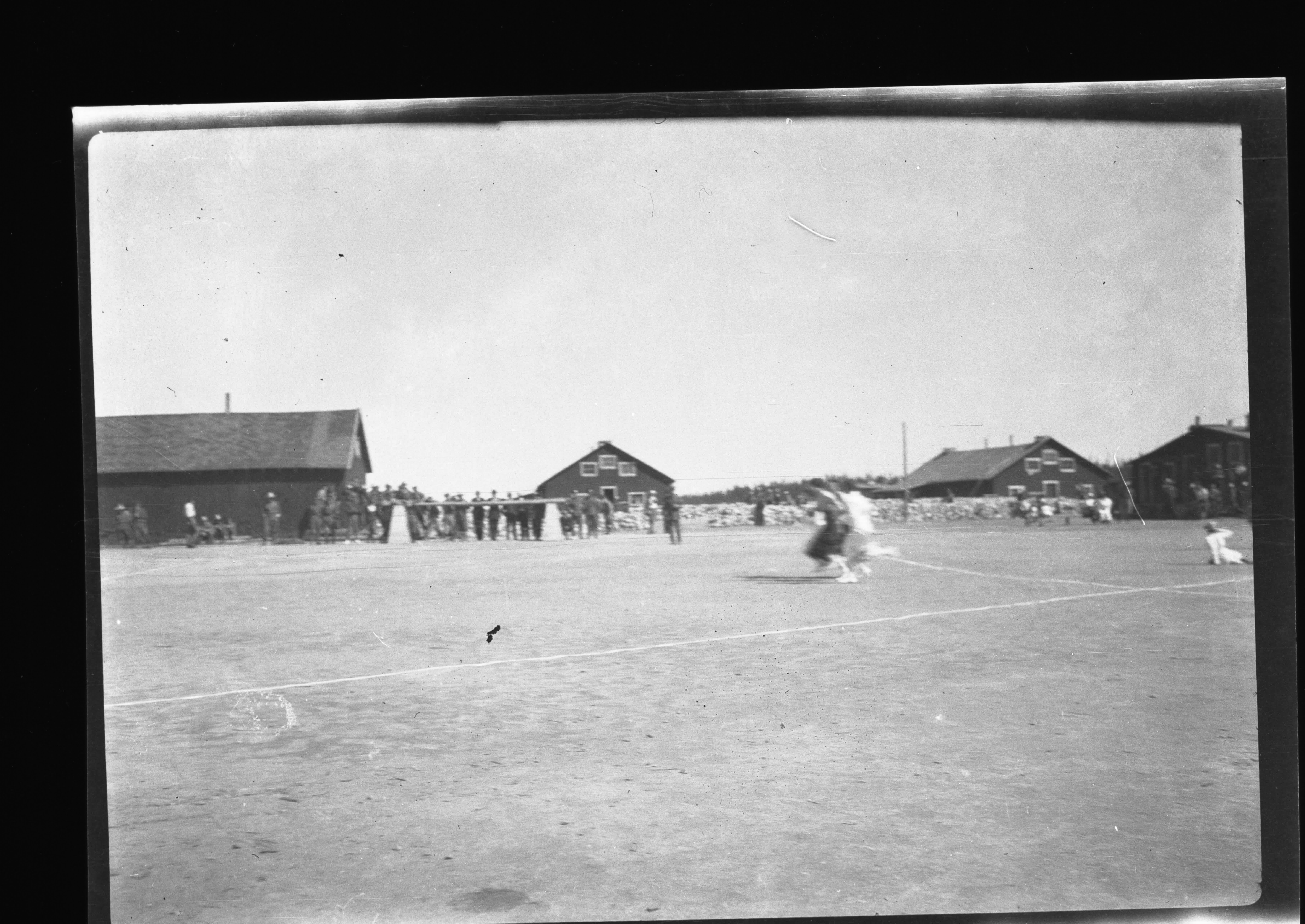Aire ouverte du camp de prisonniers, avec des prisonniers et des gardes au loin